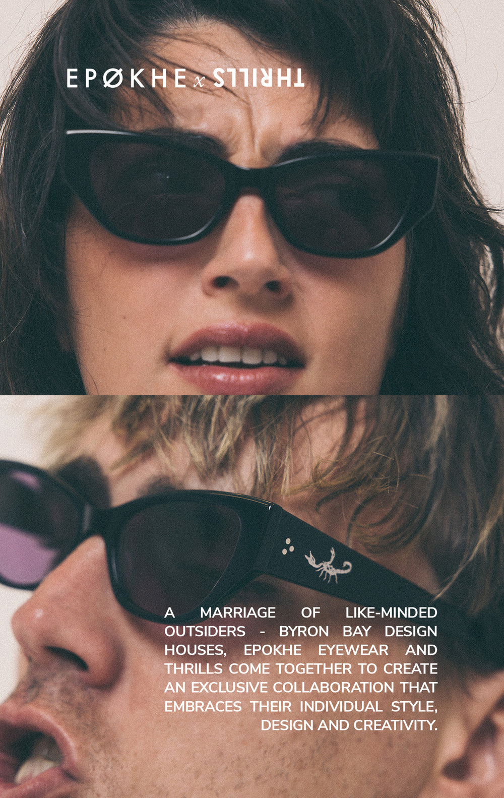 Byron Bay design houses, Epokhe Eyewear and Thrills come together to create an exclusive collaboration that embraces their individual style, design, and creativity. The two distinct yet complementary labels have carefully curated a unique offering of eyewear and soft goods, lifting the blinds on their respective worlds and inviting the rest of us in.