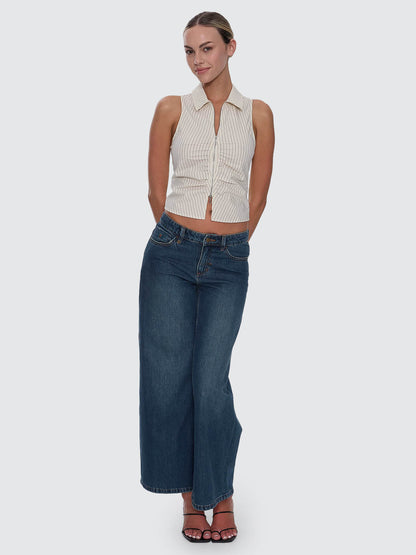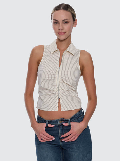 The Andy Zip Sleeveless Shirt in Butter Cream Stripe is designed to look sharp and effortless, bringing attitude to a refined, street-ready silhouette. Cut with a sleeveless tank shape and a clean zip-up front, it balances structure with stretch for a comfortable, body-hugging fit. Panel lines and centre-front shirring add subtle shape, while the striped finish keeps it classic with a modern edge. Easy to style with low-rise denims or layered under a jacket, this women's tank top is a bestseller for a reason.