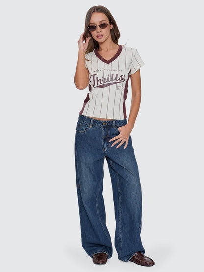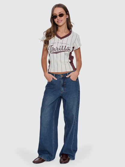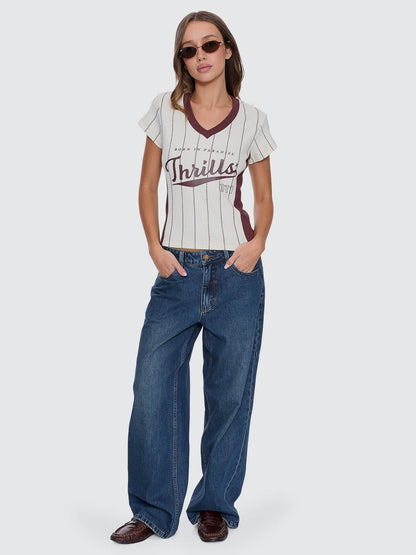 Hit the ground running with the Baseline Stripe V-Neck Club Tee in Butter Cream. Cut fitted with cap sleeves, this fine rib cotton tee brings fast, sporty energy through clean stripes and a sharp contrast V neckline. The weighty rib fabric hugs just right, holding its shape while staying comfy enough for all-day wear. A centred front print adds the unmistakable Thrills stamp, keeping things street-ready without going overboard. Easy to style with baggy denim jeans, a low-rise mini, or the matching Baseline Stripe Short, this striped tee adds flair and variety to your rotation.