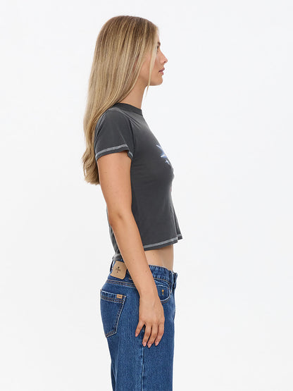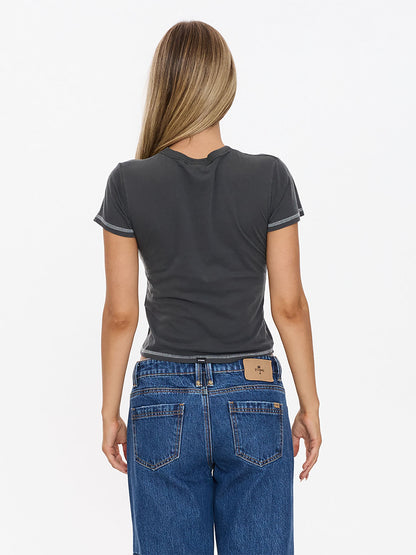 Relaxed fit, designed to fall just above low-rise pant, classic crew neck