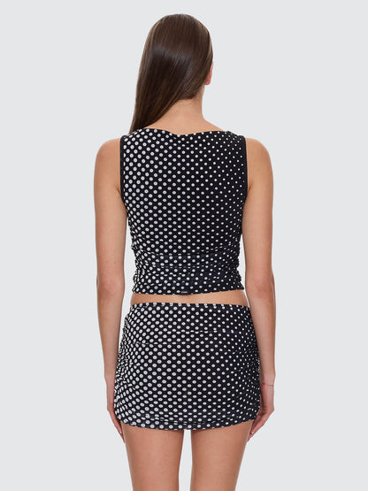 Party-ready without trying too hard, the Disconnect Mesh Tank in Black brings a sleek, slim shape with a high neck and ruched sides for a finish that flatters from every angle. The polka-dot mesh is double-lined for coverage with a hint of sheerness, so it feels confident on its own and layers clean over a bralette. Made from a nylon-mesh blend, this party tank pairs easily with low-rise denims for instant night-out energy or coordinates with our Disconnect Mesh Mini Skirt for a head-turning ensemble.