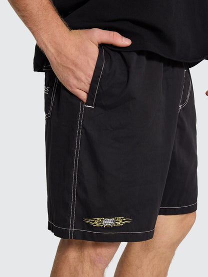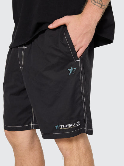 Eclipse Volley shorts deliver sharp style with bold contrast stitching that pops against the sleek black fabric. Featuring the iconic Thrills logo on both the front and back pocket, these shorts make a statement whether you're hitting the beach or the streets. Built for movement and designed to turn heads.