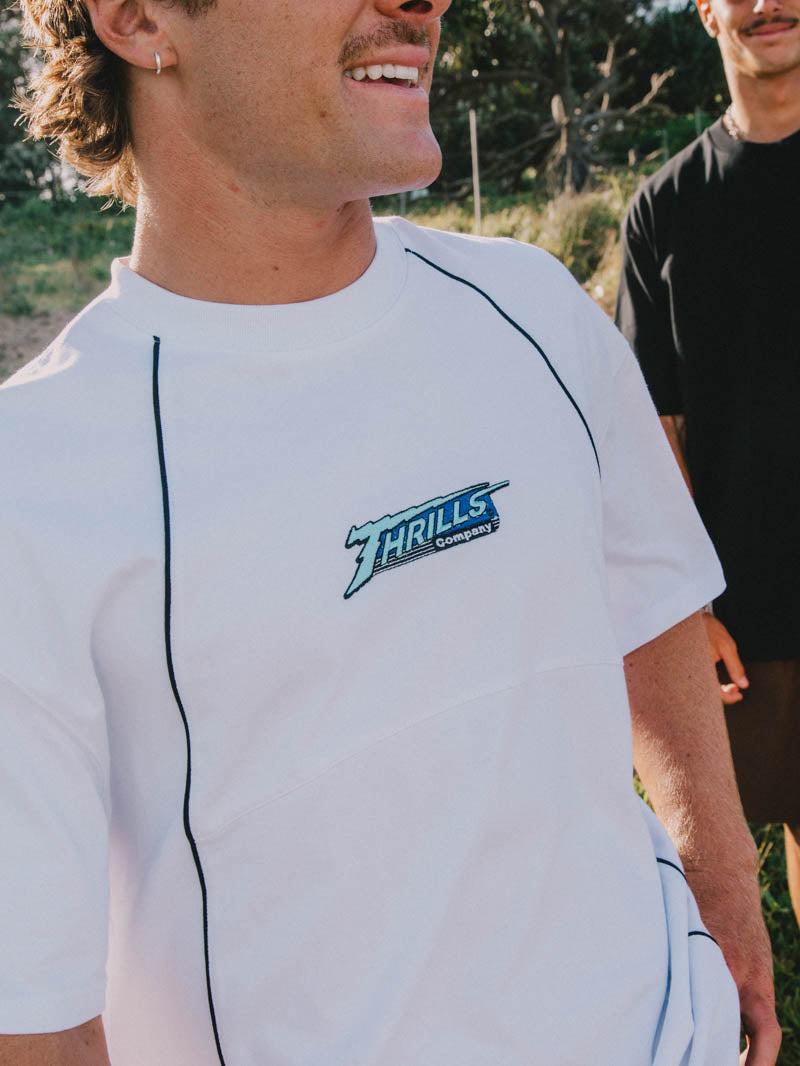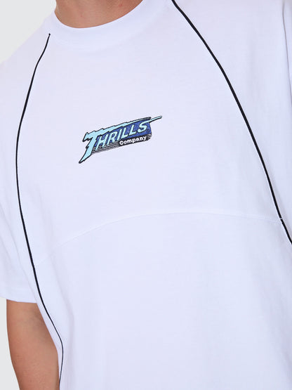Motorsport edge meet premium comfort in the Heavy Voltage Box Fit Oversize Cropped Piping Tee in White, offering a clean look with serious attitude underneath. Cut from heavyweight dry hand cotton jersey, this oversized men's tee features a wide, boxy fit for easy wear and cropped length for a modern edge. Contrast panels and piping add a sharp finish, balanced by a subtle chest embroidery patch up front. Made to stand out, this cropped tee for men is easy to wear, perfect with baggy cargo shorts for a street-ready fit.
