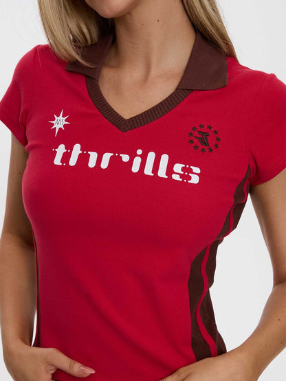 Bring the heat in the Hot Shot Polo Club Tee in Cherry. Crafted from fine rib organic cotton tee Australia, itÕs fitted, stretchy, and made to move with you. The sporty V-neck polo cut and contrast side panels throw it back to vintage athletic gear, while the bold Thrills logo across the chest seals the deal. Perfect with low-rise denims, mini skirts, or our Hot Shot Booty Short in the same colourway, this streetwear t shirt Australia staple brings instant attitude. Cop yours online with tees Afterpay Australia, or grab it in our tees sale Australia with free shipping AU-wide.
