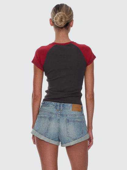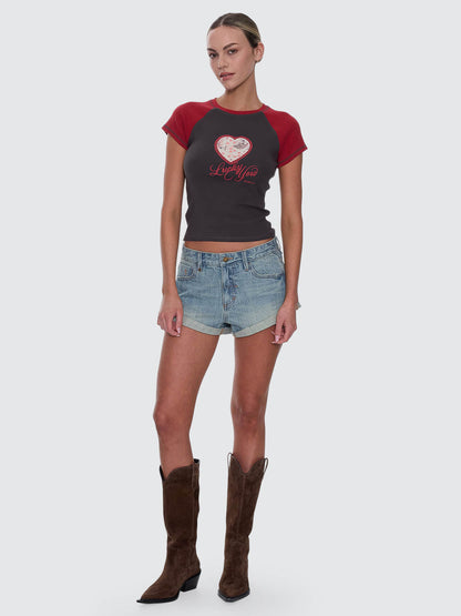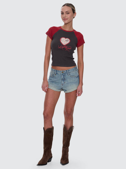 Sweet with a bite, the Lucky You Raglan Club Tee in Merch Black brings street edge to a fitted, throwback-inspired silhouette. Cut from fine rib cotton with added stretch, it hugs close while staying comfortable enough for all-day wear. Contrast raglan cap sleeves add a sporty edge, while the centre-front print delivers the playful, stylish energy. Easy to pair with baggy denim, mini skirts, or layered under a button shirt, this club tee does more than basics ever could.