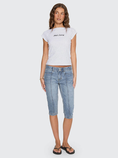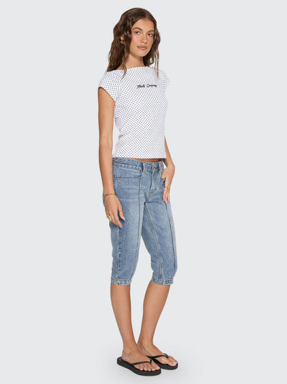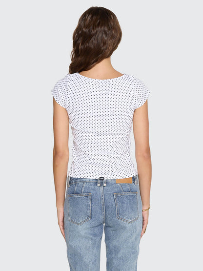 The New Romance Boat Neck Tee in White Polka Dot brings playful charm with a touch of vintage attitude. Designed in a fitted silhouette with a flattering boat neckline and cap sleeves, it's the perfect blend of sweet, sultry, and street. Crafted from soft cotton-elastane fine rib blend, it moves as you move, offering the perfect stretch for a flattering finish. The centre front embroidery adds a subtle nod to ThrillsÕ signature minimal edge. Pair it with baggy women's jeans or a skirt for a chic, effortless streetwear look.