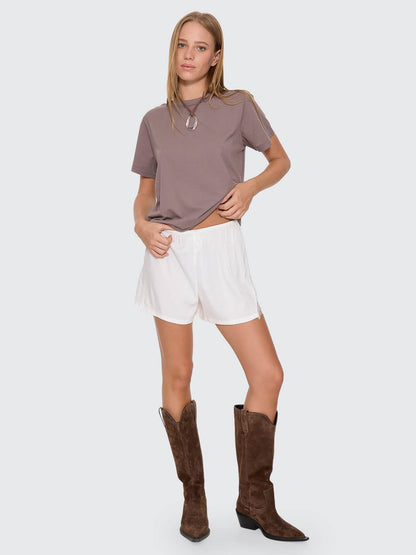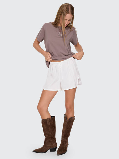 Flirty lace detailing runs along the sides of these ivory shorts, adding a touch of romantic flair to your everyday wardrobe. The delicate lace panels create an effortless blend of elegance and edge.