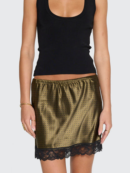 Slip into effortless charm with this playful mini skirt. The olive green base pairs perfectly with delicate polka dots for a look that's equal parts vintage-inspired and modern edge. Designed as a versatile slip silhouette, it layers beautifully over basics or stands alone for those moments when you want to make a statement. Perfect for dressing up casual outfits or adding a flirty touch to your everyday rotation.