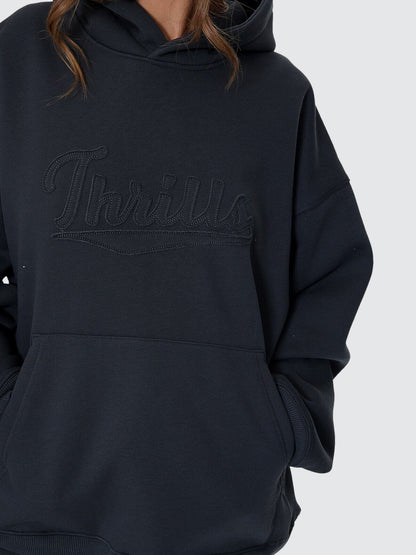 Lock into comfort with attitude in the Playmaker Cocoon Panel Hood in Carbon. Cut oversized with a slouchy, effortless energy, this heavyweight hoodie for women hits different from the first wear. Brushed fleece brings serious warmth, while the cocoon panelling and front pouch keep the silhouette clean but street-ready. Finished with bold applique detailing, itÕs made for late nights, cold mornings, and everything in between. Match this women's hoodie with our Playmaker Track Pant for a full fit moment.