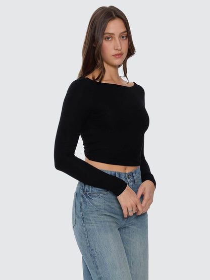 Clean and sleek with a twist where it counts, the Reese Backless Long Sleeve Top in Black keeps things minimal but far from boring. Designed with a flattering boat neckline and a slim, body-hugging fit, this women's knit top feels smooth and soft with a stretchy finish. Turn around, and the open back does all the talking, adding a hit of after-dark attitude to an otherwise understated silhouette. Made to pair effortlessly with low-rise jeans, skimpy skirts, or tailored pants, this long-sleeve knit top brings quiet confidence into your women's clothing rotation.
