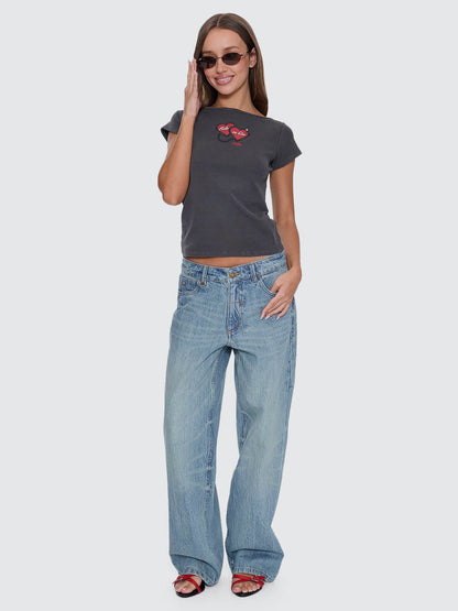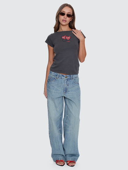 Own the moment with the Ride Or Die Boat Neck Tee in Merch Black. Cut slim with a clean boat neckline, this women's tee hits the perfect balance between throwback attitude and modern street polish. Made from a soft fine-rib cotton blend with a touch of stretch, it features cap sleeves and a bold front print to dial up the street edge. A natural match for high-waist denim jeans, baggy cargos, or a low-rise mini, this lightweight rib top brings ride-or-die energy to every fit.
