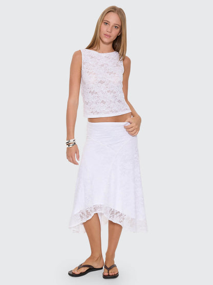 Elevate your wardrobe with the Sienna Lace Midi Skirt in crisp white. This versatile piece pairs beautifully with our matching New Romance Lace Tank for a coordinated look, or style it solo with your favourite plain tee or casual top. The delicate lace detailing adds feminine charm while the midi length keeps things effortlessly chic. Perfect for everything from weekend brunch to evening outings.