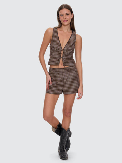 The State Of Mind Check Top in Postal Brown nails throwback charm with a modern edge, featuring a regular fit, deep V neck, and a tie-front that lets you tweak the shape. Cut from yarn-dyed cotton, it feels light and breathable, finished with delicate lace trimming that softens the lines. Wear it with the matching shorts for a coordinated moment, or mix and match with baggy denim and boots for weekend runs. Easy, flattering, and ready to make a statement, this checkered top is a fresh favourite to add to your women's streetwear rotation.