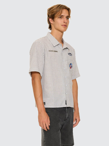 Workwear attitude meets modern streetwear in the Super Charged Short Sleeve Cropped Check Work Shirt in White. Crafted from a breathable blend of cotton and linen yarn dye check, this piece from our men's shirts AU selection is lightweight yet structured, making it an easy favourite for layering and everyday wear. The cropped cut and boxy silhouette give it a progressive edge, while the subtle motorsport-inspired patches nod to ThrillsÕ high-octane influences. A versatile staple in men's fashion AU-style, this button shirt balances vintage workwear roots with a shorter, modern fit. Available now to buy online with free shipping AU-wide.