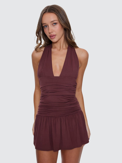 Turn up the heat in the Tommie Halter Mini Dress in Bitter Chocolate. Designed to make a statement, this mini dress brings bold confidence through a ruched body that accentuates the right places and an elasticated finish that keeps things comfy all night long. The halter neck tie adds a throwback hit with a clean, adjustable fit, while the soft modal stretch fabric keeps it smooth and effortless. Built for late nights, loud playlists, and spontaneous plans, this halter mini dress deserves a spot in your women's clothing rotation.