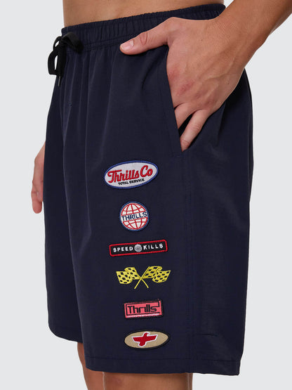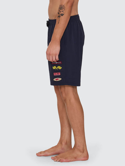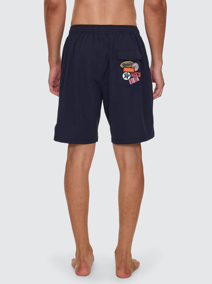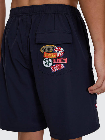 Old-school service vibes meet beach-to-street comfort in the Total Service Volley in Navy. Cut baggy for room to move, itÕs made from a quick-dry nylonÐspandex blend with 4-way stretch, so it keeps up from ocean dips to daily wear. An elastic waist with drawcord lets you dial the fit, side pockets handle the essentials, and a back pocket with key loop and Velcro closure locks things down. Finished with front embroidery and stacked patches for extra character, this volley short is easy, durable, and made for heavy rotation.
